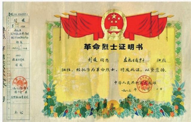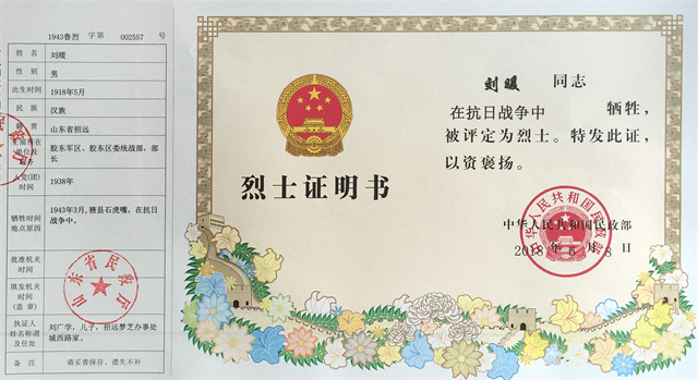 2018年6月8日,经逐级审核上报,补充完善还原刘暖烈士职务信息后,国家民政部换发的烈士证明书。