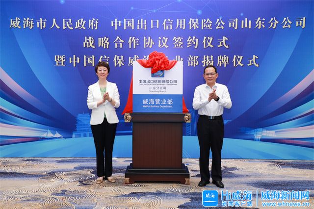 Hi威海客户端讯 9月14日,威海市人民政府、中国出口信用保险公司山东分公司战略合作协议签约仪式暨中国信保威海营业部揭牌仪式举行,市委副书记、市长孔凡萍,中国信保山东分公司党委书记、总经理韦少敏出席签约仪式并为营业部揭牌,副市长邓勇参加活动。