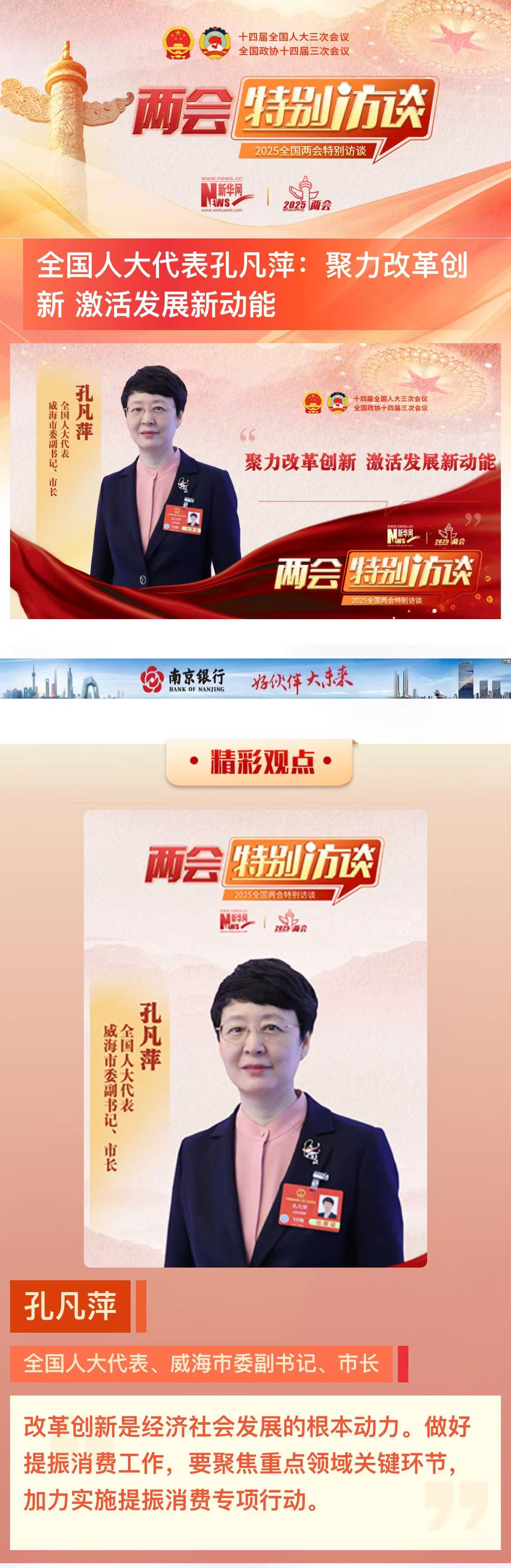 正在参加全国两会的全国人大代表、威海市委副书记、市长孔凡萍在接受新华网记者采访时表示,“改革创新是经济社会发展的根本动力。”今年全国两会,她围绕以创新举措推进消费提振、产业升级等提出建议。