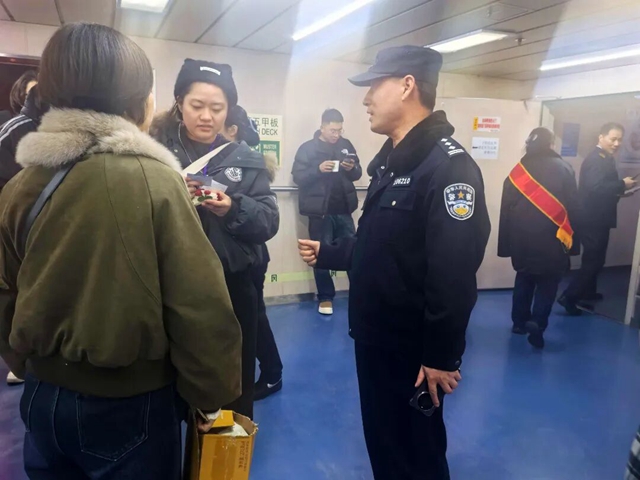 夜深了,多数游客已进入梦乡,客船内逐渐安静下来,李秀奎仍在船舱内巡逻。一名喝了酒的旅客迎面走来,李秀奎顿时停下脚步,几句闲聊,便将对方的情况了解了大概。见对方情绪没有异常,李秀奎安心些许,又忍不住叮嘱:“海上颠簸,喝了酒容易晕船,早点回舱休息,提前祝你春节快乐。”