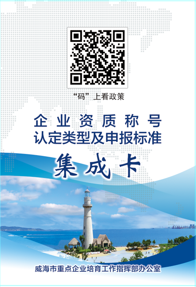 Hi威海客户端讯 记者从市重点企业培育工作指挥部办公室获悉,我市推出企业资质称号“集成卡”,汇总梳理137项国家、省、市三级企业资质称号认定类型及申报标准、奖补政策等。企业可通过手机扫描集成卡二维码,找到适合自己的发展路径和政策支持。