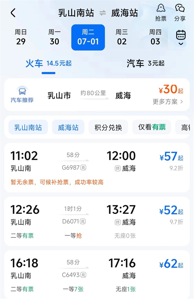 D6071次列车于8时50分在济南始发,12时18分抵达乳山南站,13点27分抵达威海站。