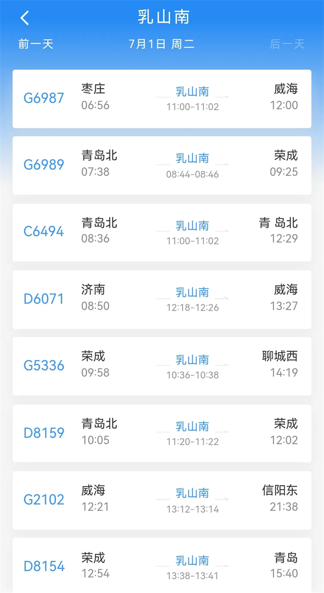 G6987次列车于6点56分在枣庄始发,11时抵达乳山南站,12时抵达威海站。