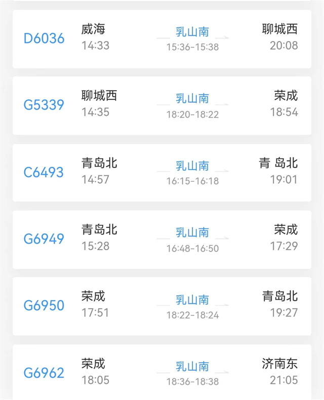 C6493次列车于14时57分在青岛北站始发,16时15分抵达乳山南站,17时16分抵达威海站。