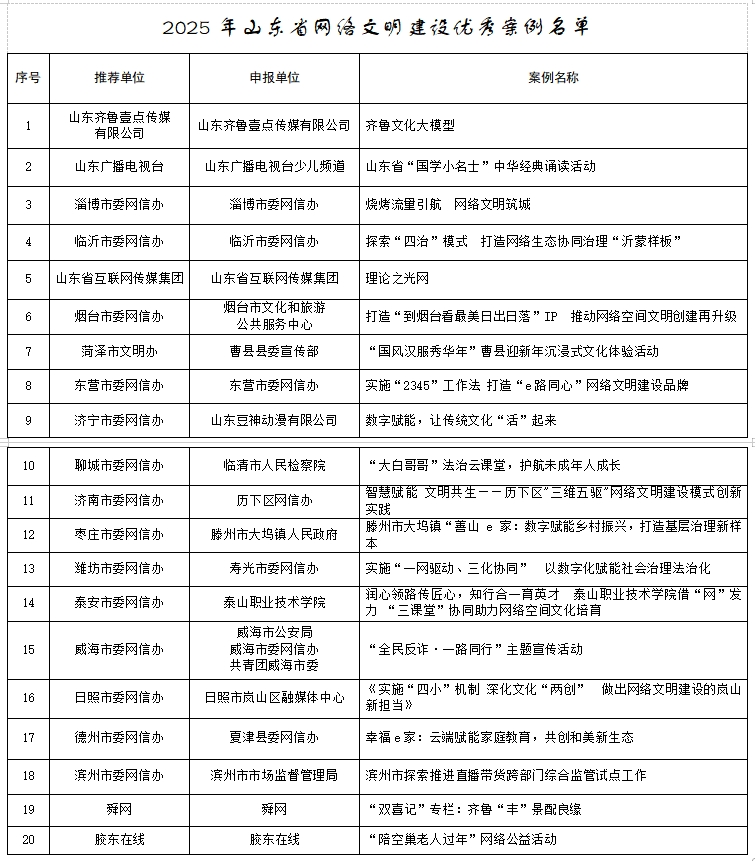经过严格的筛选与评审,包括“齐鲁文化大模型”“山东省‘国学小名士’中华经典诵读活动”“烧烤流量引航网络文明筑城”在内的20个优秀案例脱颖而出,成为本次活动的亮点。这些项目不仅展现了山东省在网络文明建设方面的创新与努力,也为全国网络文明建设提供了宝贵的经验和启示。