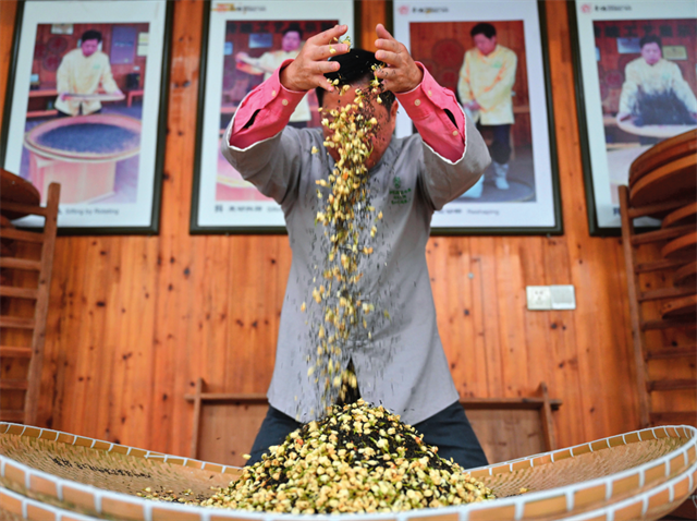 在福州茉莉花茶制茶工坊,福州茉莉花茶传统窨制工艺大师傅天甫进行制茶的第六道工序“窨”(2022年12月16日摄) 周义摄 / 《瞭望》