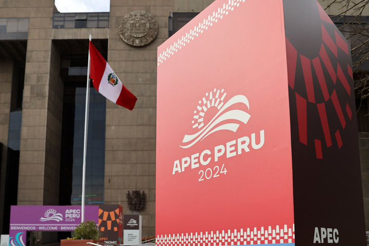 这是2024年11月10日在秘鲁首都利马拍摄的2024年亚太经合组织会议标识。新华社记者 李木子 摄
