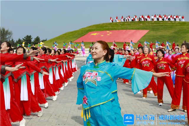 放眼望去,五星红旗在绿草地的映衬下显得格外鲜艳,身着各色服饰的舞者,宛如流动的风景线,场面唯美、激动人心。高区怡园街道泰和社区居民刘颖、张纯丽、于敏丽等身穿具有海洋渔家元素的蓝色服饰,前来参加表演。“我们认真练了20天,有专业老师到社区教我们,很幸福,而且满满的成就感。”刘颖说。
